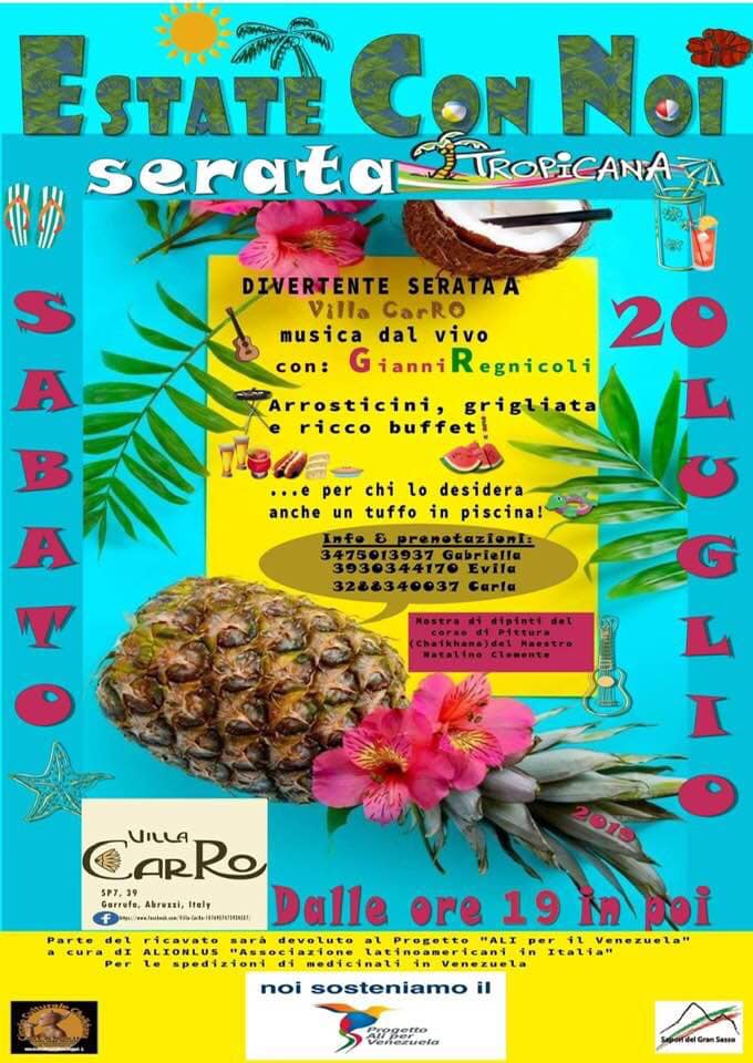 Serata Tropicana SABATO 20 LUGLIO 2019, dalle ore 19:00. Musica dal vivo con: Gianni Regnicoli. Arrosticini, grigliata e ricco buffet!… Continue reading